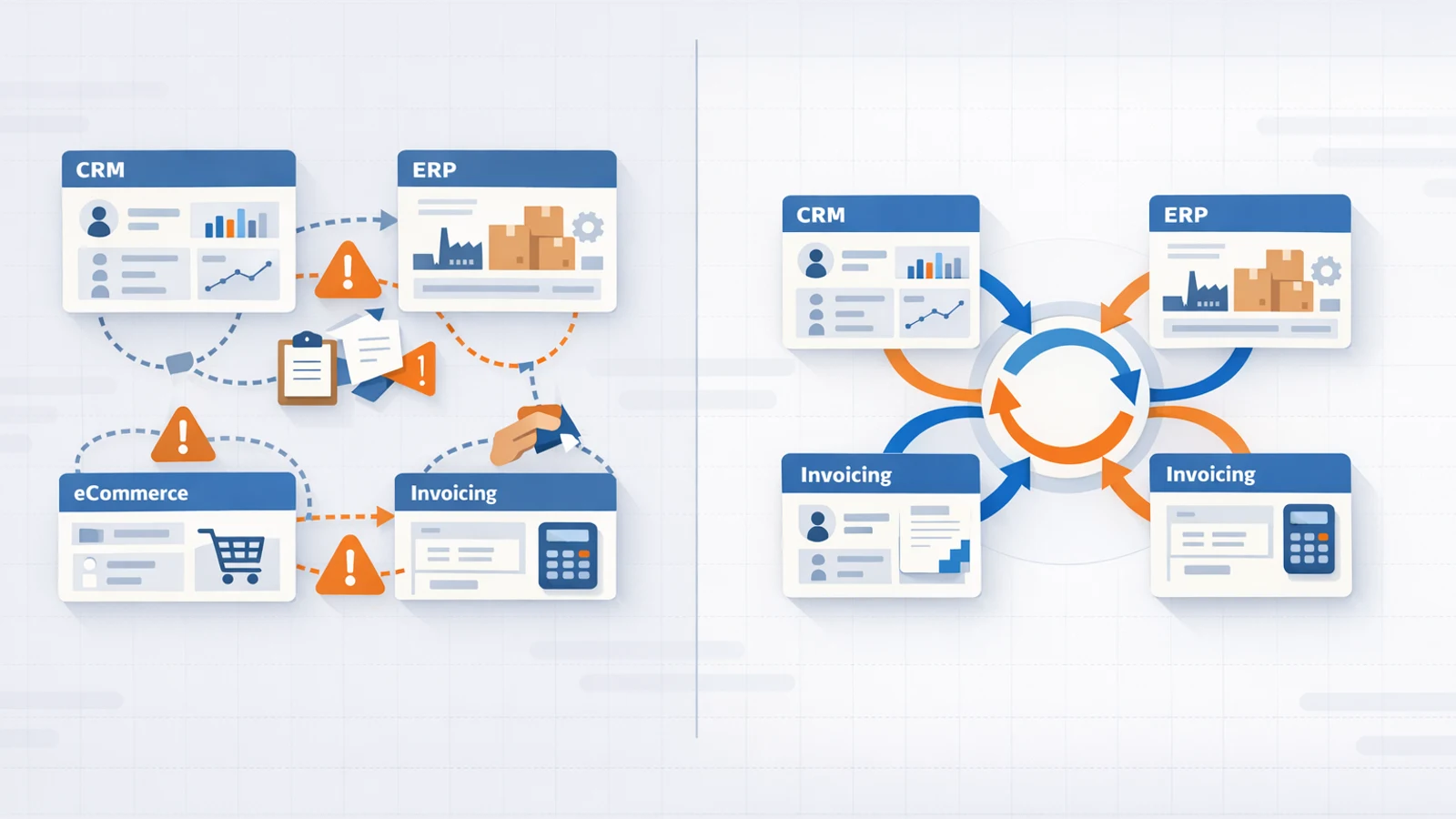 Guía práctica para detectar cuándo el problema no es falta de software, sino la ausencia de integración entre CRM, ERP, ecommerce y facturación.